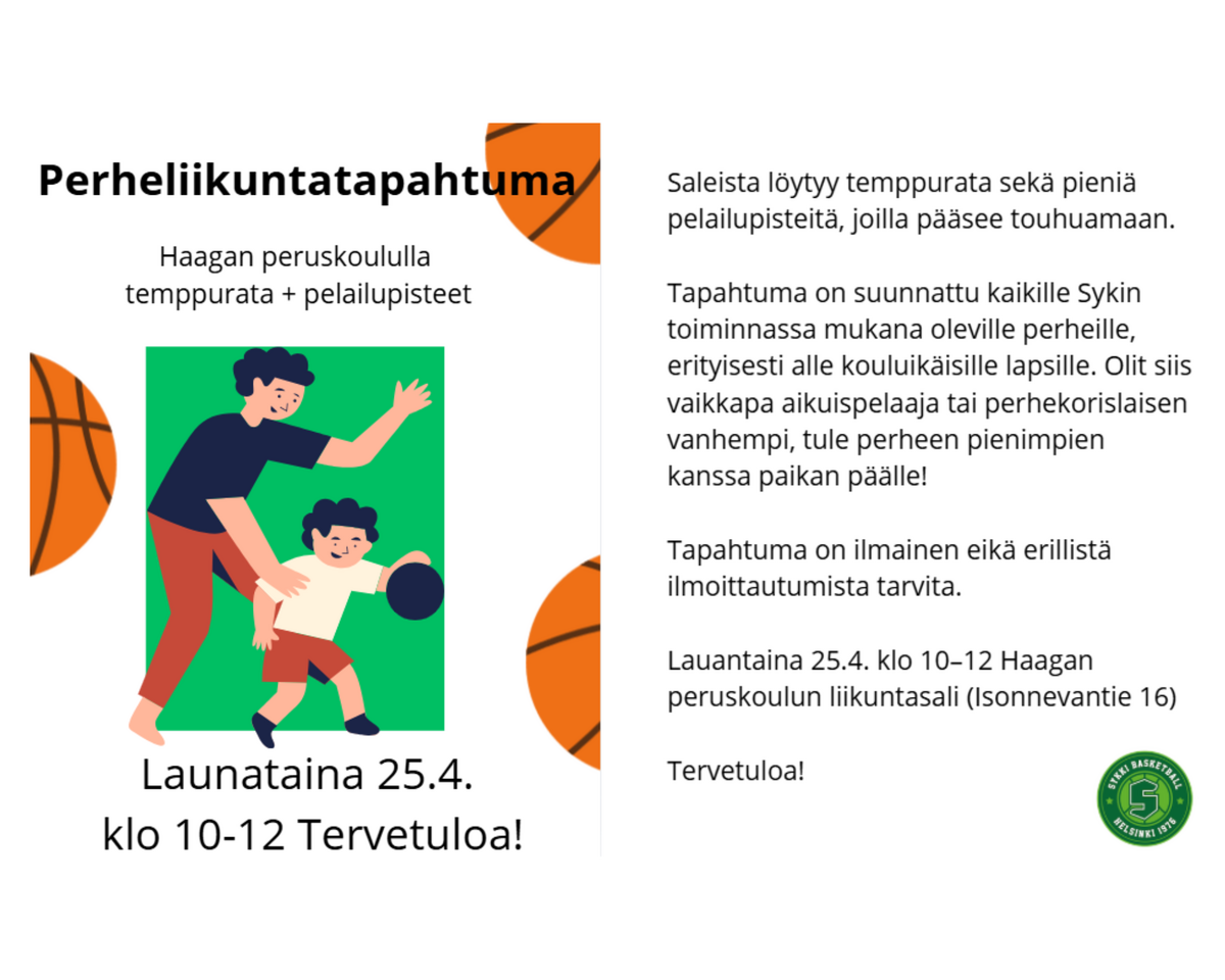 Perhekoristapahtuma järjestetään Haagan peruskoululla (Isonnevantie 16). Tarjolla vapaata touhuamista ja tehtäväpisteitä seuran alle kouluikäisille.